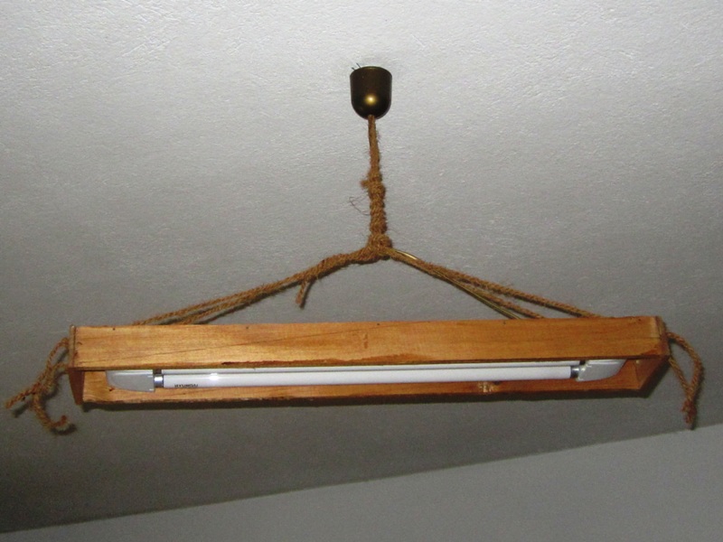 Λίγα κομμάτι ξύλο και ηλεκτρική εγκατάσταση δημιούργησαν ένα παραδοσιακό φωτιστικό που κοσμεί την κουζίνα μας δημιουργία.