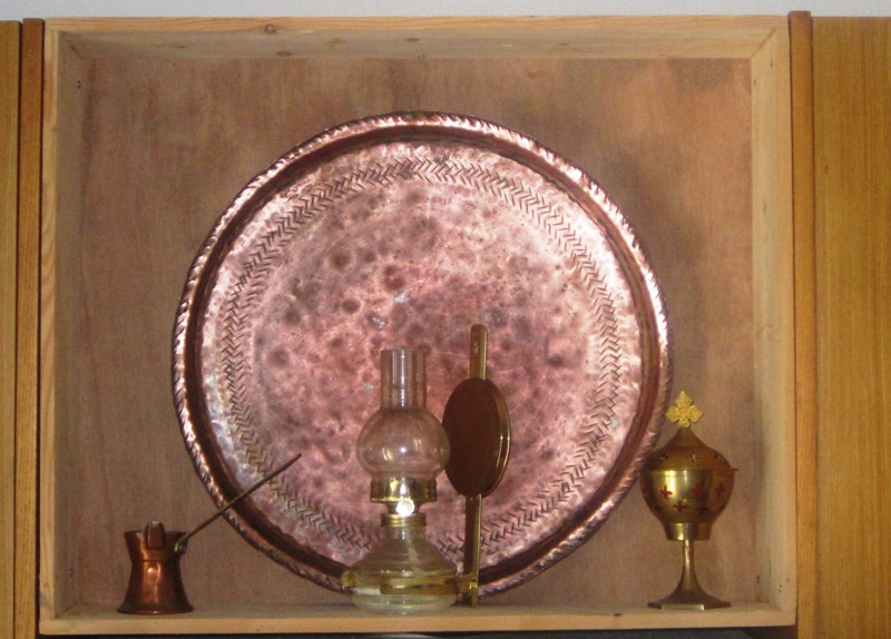 Η ιδέα προήρθε από μια παρόμοια κατεστραμμένη θήκη της γιαγιάς. Αντιγράψαμε το σχέδιο και φτιάξαμε μια θήκη που φιλοξενεί το λάδι το ξύδι το αλάτι και το πιπέρι. Παρόμοια σε μεγαλύτερο μέγεθος κατασκευή χρησιμοποιούμε για να βάλουμε τα τέσσερα πρώτα εμφιαλωμένα κρασιά παραγωγής μας , έτοιμα για κατανάλωση στο σπίτι μας με τους επισκέπτες φίλους μας.