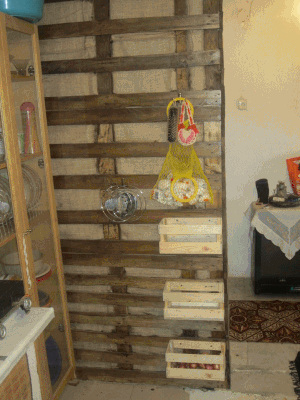 Στον ξύλινο τοιχο που διαχωρίσαμε έναν ενιαίο χώρο, προσθέσαμε τρία καφασάκια τα οποία θα χρησιμοποιηθούν ως αποθηκευτικός χώρος. Αντικαταστήσαμε τον παραδοσιακό <<Μπακάλη>> . Δείτε την σύνθεση